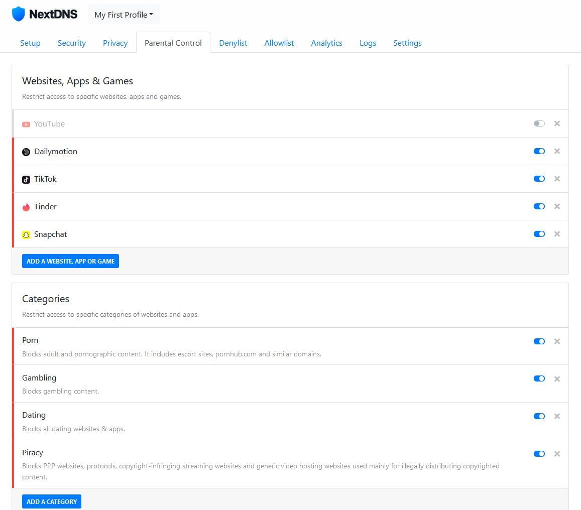 A DNS filter can block specific websites or even categories of websites. DNS services will often also provide ways to block certain kinds of traffic at different times of day. Here is what my NextDNS setup looks like at home to help keep my kids out of trouble: